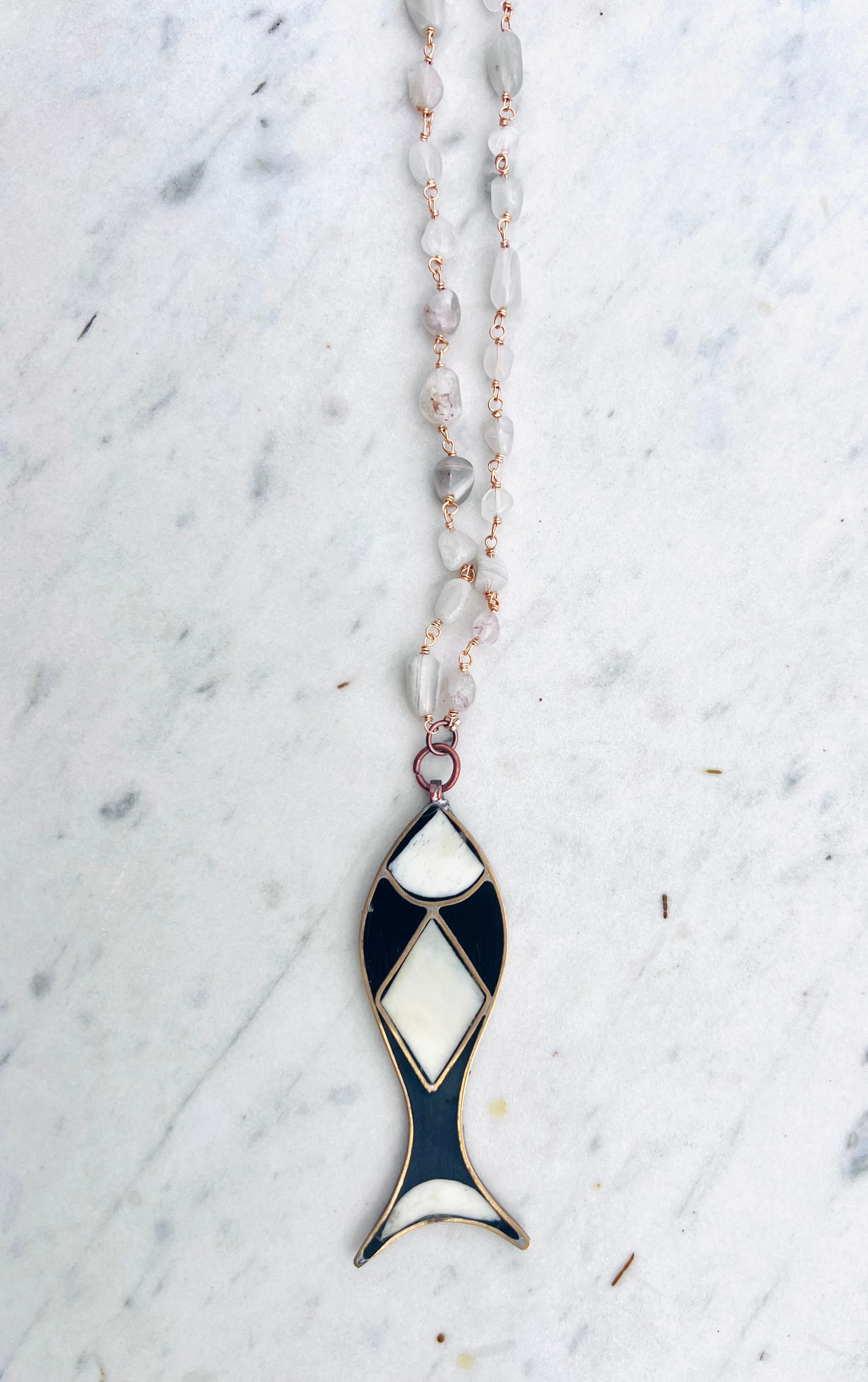 Handmade in Amalfi by JP, this unique necklace features a fish-shaped pendant crafted in brass and mixed metals, enriched with natural stones.