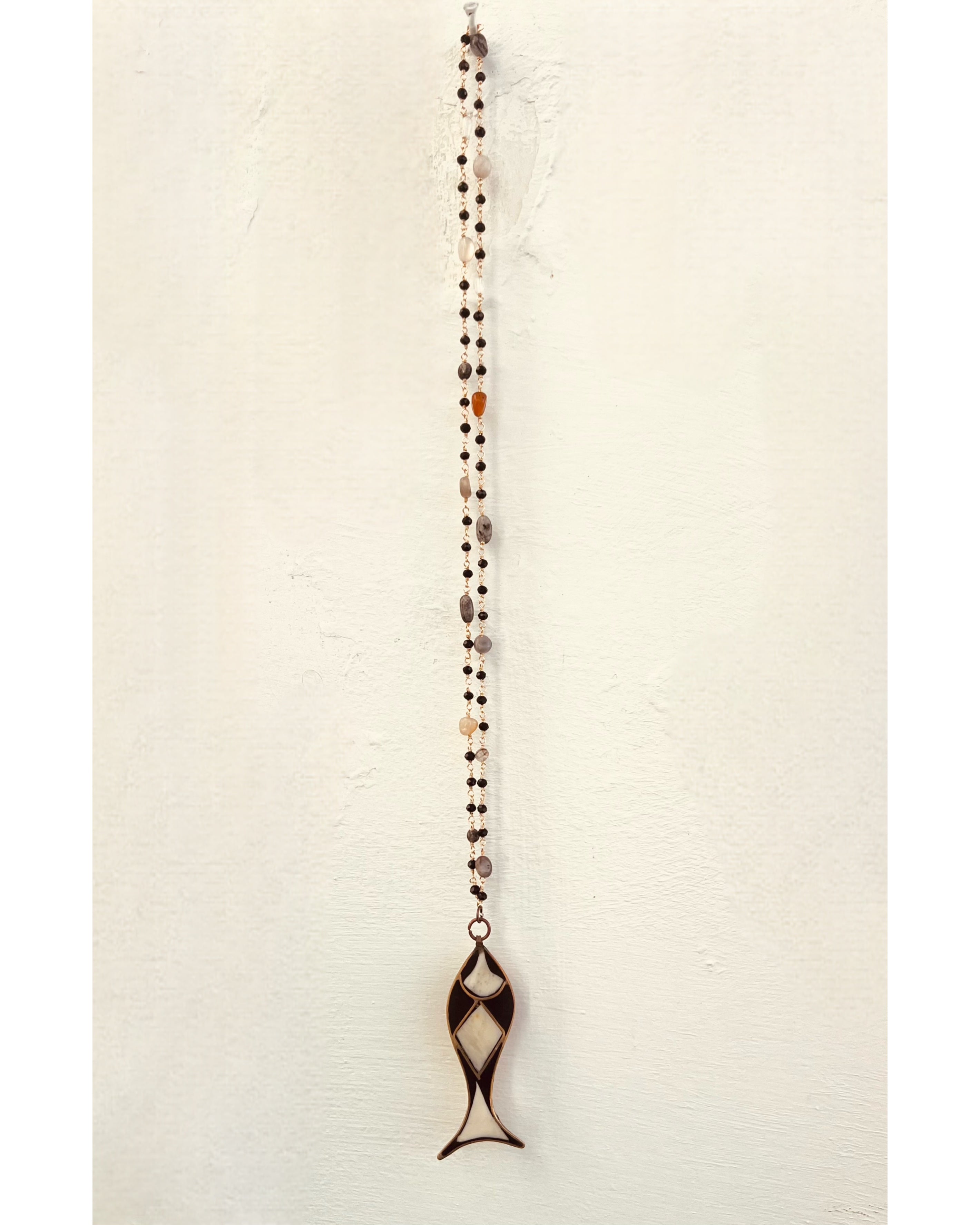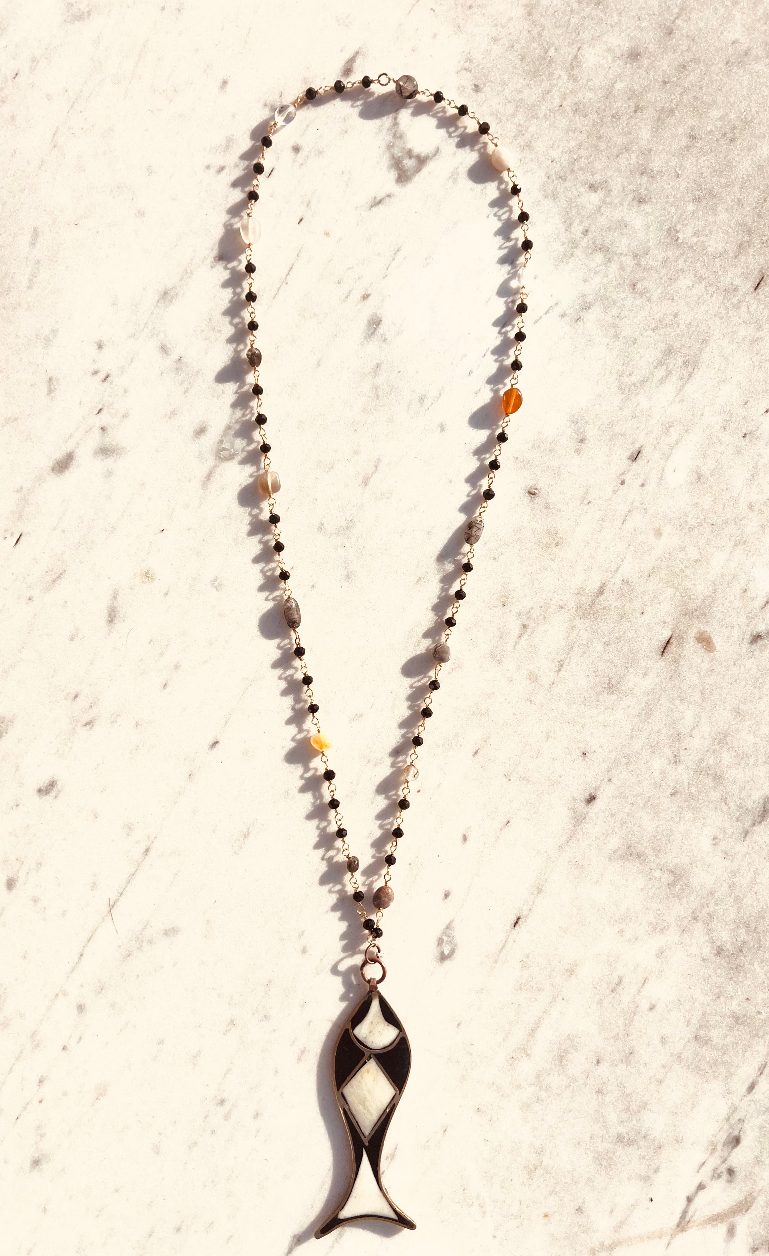 Handmade in Amalfi by JP, this unique necklace features a fish-shaped pendant crafted in brass and mixed metals, enriched with natural stones.